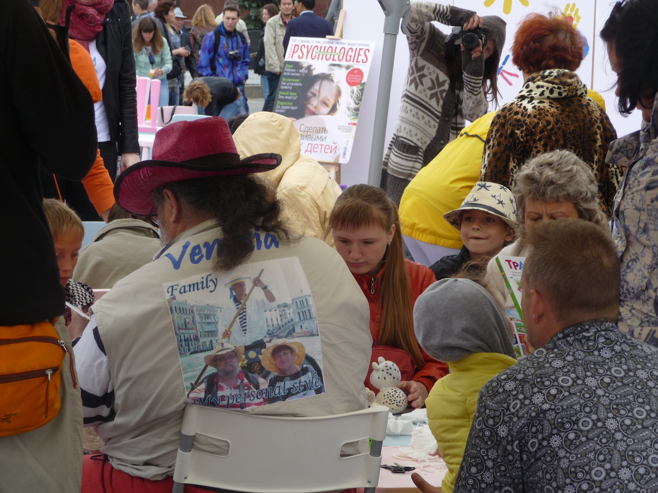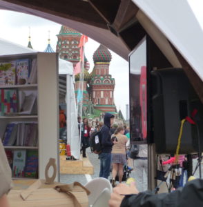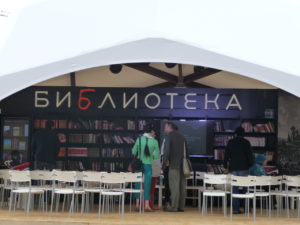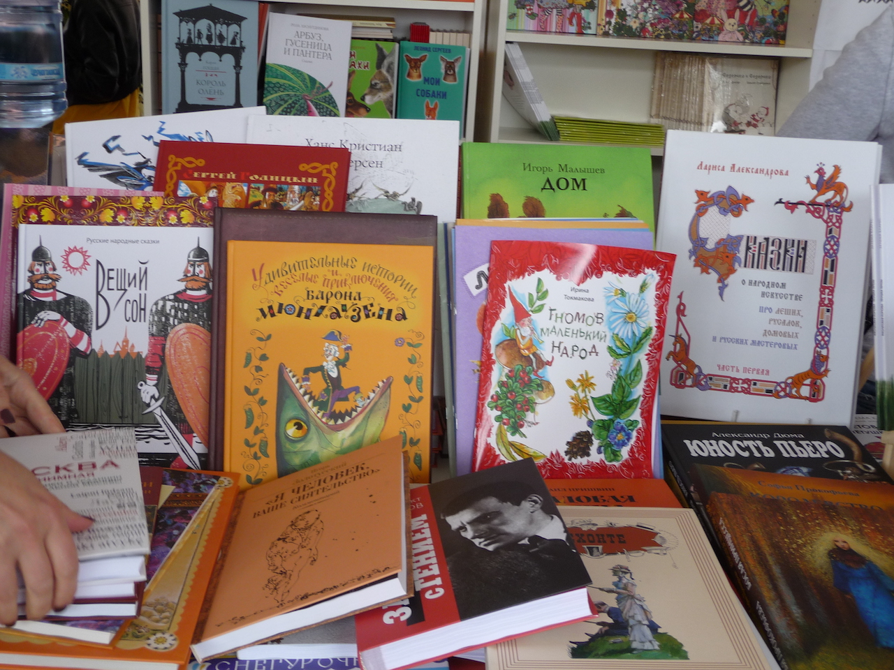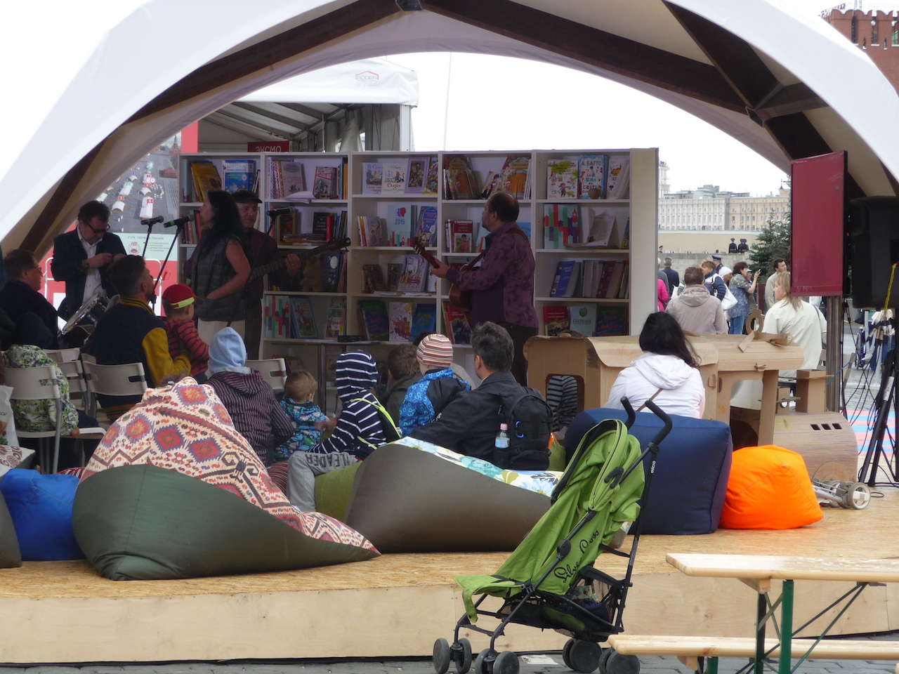 In realtà qui ci sono anche stranieri, che, pur non leggendo russo, sono attratti da questa atmosfera di fiaba. O magari c’e anche chi, come me, cerca di studiare questa lingua difficile ma affascinante attraverso i fumetti e i libri illustrati per bambini. Tende bianche e colorate invadono la piazza e la rallegrano. Gli spazi maggiori sono dedicati ai libri per ragazzi, i tendoni che ospitano autori che presentano libri sono pieni di bambini vocianti che ridono, ballano, ascoltano e corrono dietro a tanti palloncini. Gli adulti prendono fiato, distendendosi un po’ su candidi divanetti accoglienti. I passeggini parcheggiati occhieggiano.